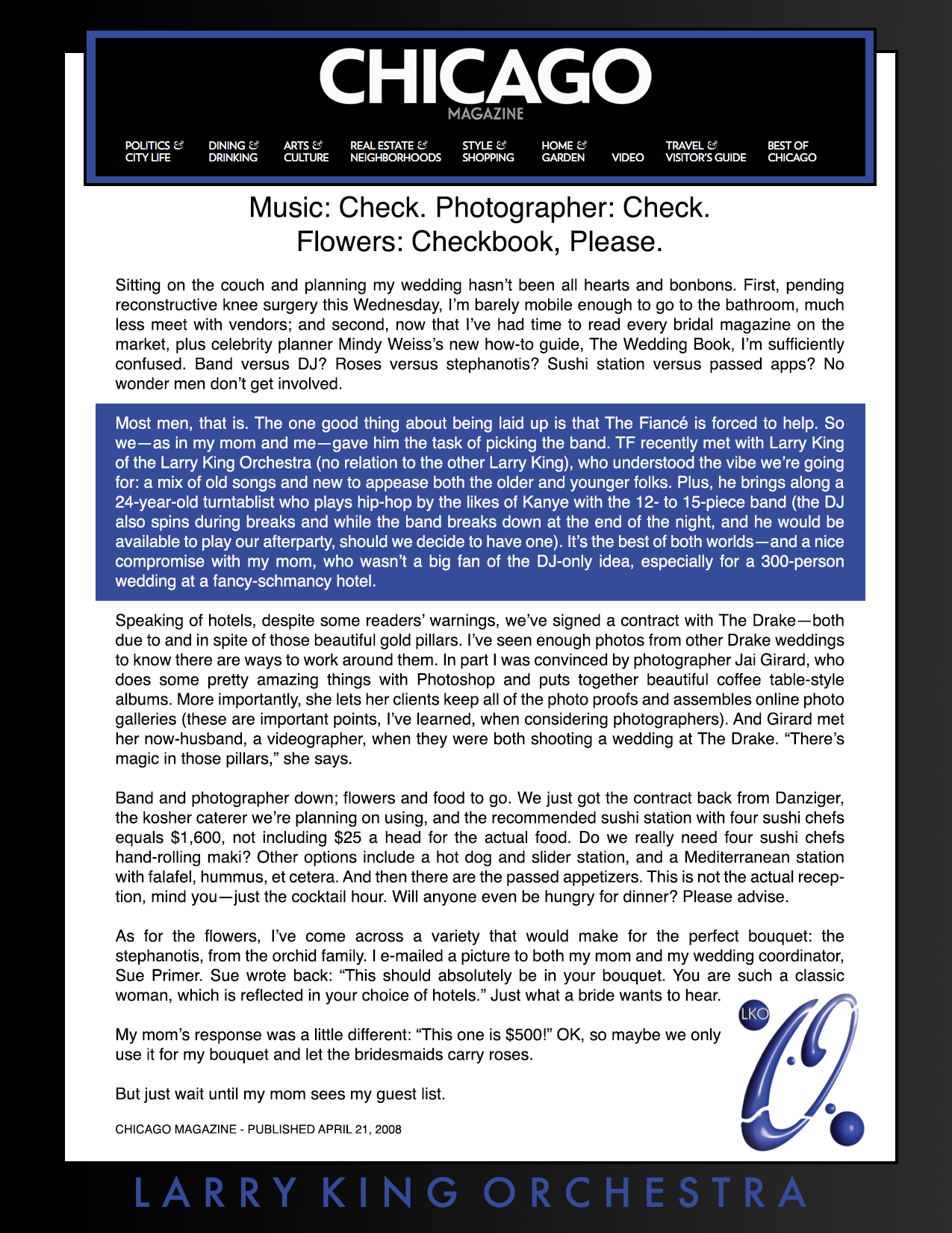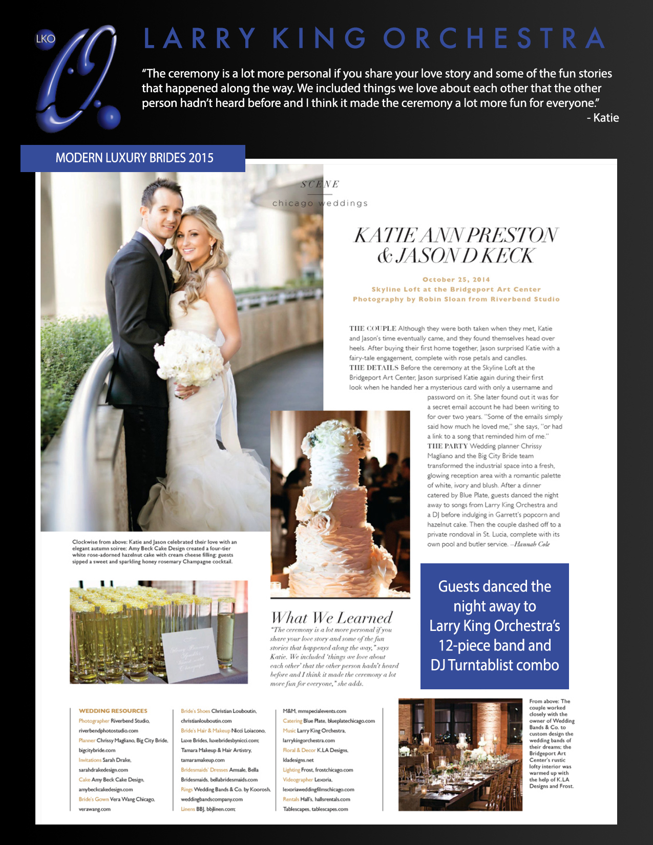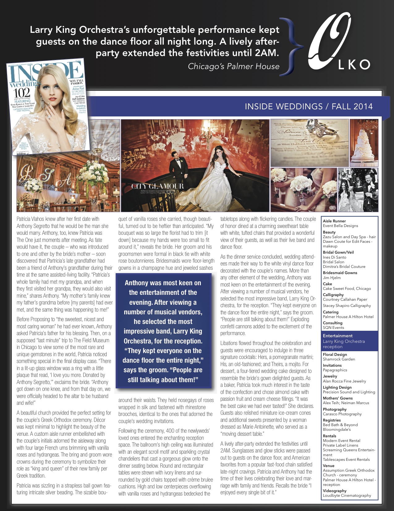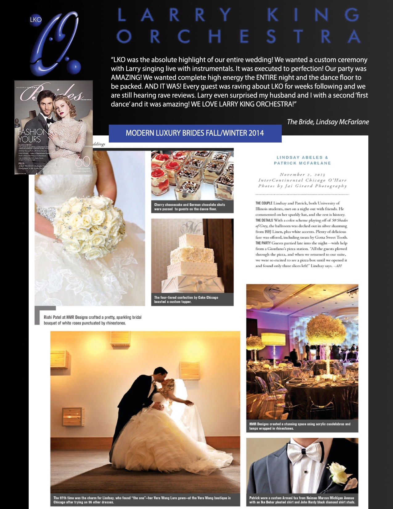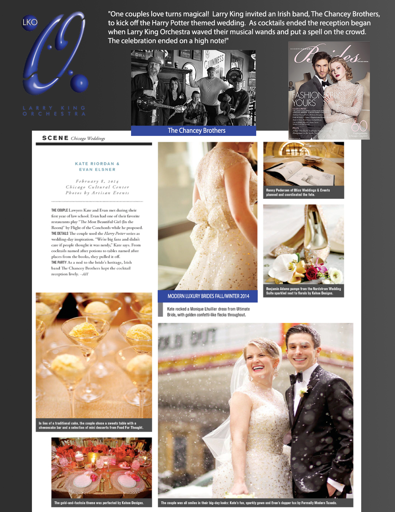 LKO Press Chicago Wedding Spring 2017 Wedding Guide Chicago Winter/Spring 2017 Chicago Wedding Winter 2017 Newberry Library Chicago 2016 Blackhawks Modern Luxury Weddings 2016 Wedding Guide Chicago 2016 Carrots & Cake 2016 Chicago Wedding Fall 2016 Modern Luxury Brides Spring/Summer 2016 Elkhorn, Wisconsin Summer 2016 Inside Weddings Editors Circle 2016 Chicago Illuminating Company 2015 SPLASH Sun-Times 2015 Modern Luxury Brides 2015 Carrots & Cake 2015 Inside Weddings Summer 2015 St. Louis Bride Summer 2015 Ritz-Carlton Chicago 2015 Carrots & Cake2015 Ceci Style New York 2014 Modern Luxury Brides 2014 Modern Luxury Brides 2014 Inside Weddings Fall 2014 Carrots & Cake2013 Inside Weddings Winter2013 CS Brides Magazine2012 People Magazine Wedding 2011 Illinois Meetings Events 2011 CS Brides Magazine 2009 Scene Chicago Weddings 2009 Chicago Magazine April 2008 Scene Chicago Weddings 2008 Modern Bride Magazine 2007 Raves and Reviews Clients LKO Press Soleil Moon Reviews
